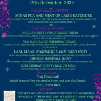 Start:Onion Bhaji's OR Poppadoms , For the whole party Any same 2 *Mains, Any 1 same Side veg from: Dhal, Chickpea, Bombay potato) , Pilau Rice All £19.00 pp head.