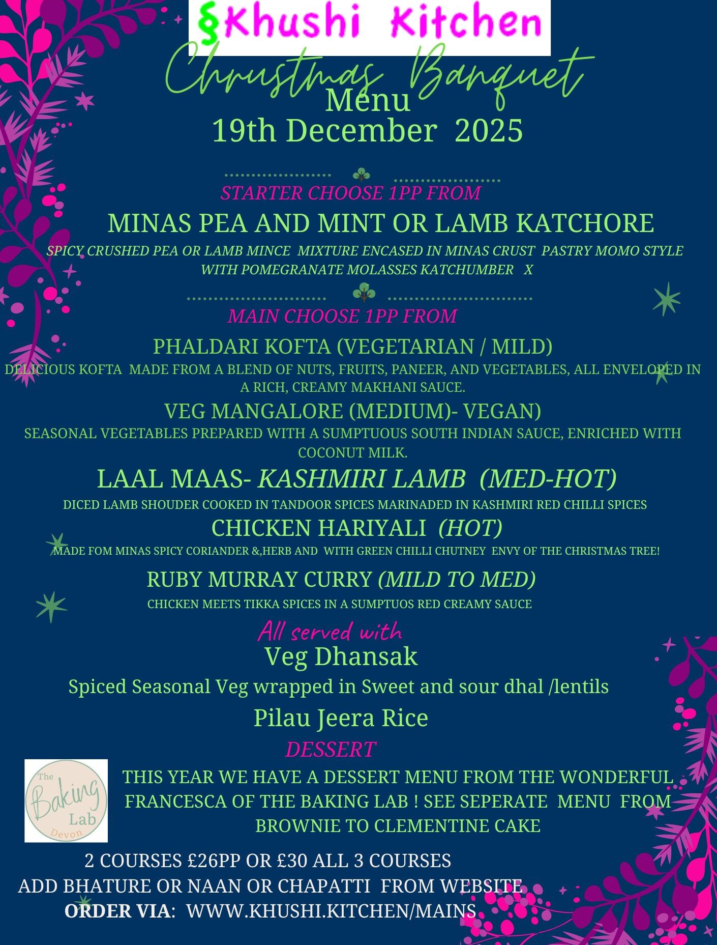 This year we have 2 courses (with bells and whistles ) for £26pp and with dessert only £30 pp - that's a whole banquet for £30